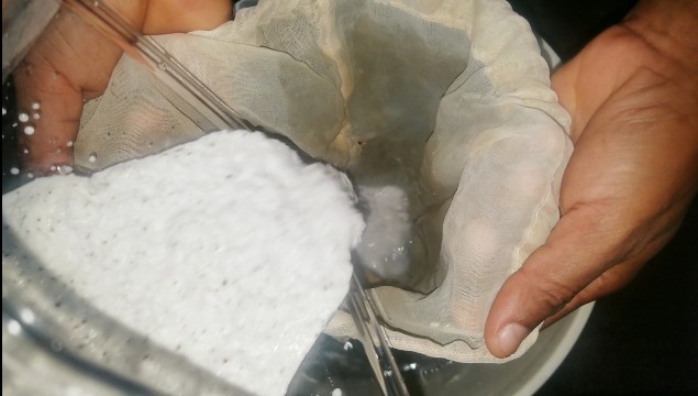 Using your hand and making sure that the coconut mixture in the sieve cloth bag is submerged in water, squeeze the bag to extract the coconut milk into the water.